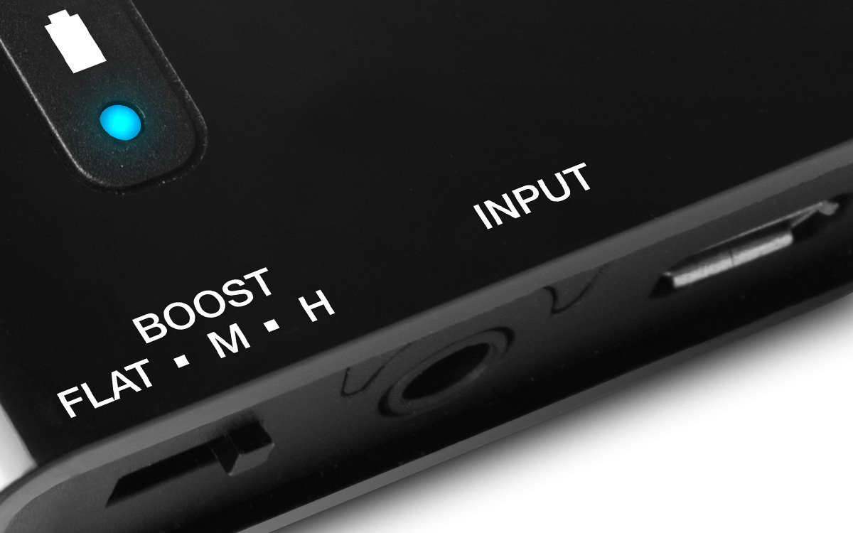 Bass Traveler is a portable headphone amplifier with two 1/8-inch headphone jacks that lets two people listen at the same time to the same signal. Many personal digital music players have a limited output for driving high-quality headphones—which may have a higher impedance, a lower passband voltage sensitivity or both—but Bass Traveler has a 2-level gain switch to boost the signal level, so the sound is always crisp and clear. It is ideal for use with virtually all headphones from 16-100 ohms.