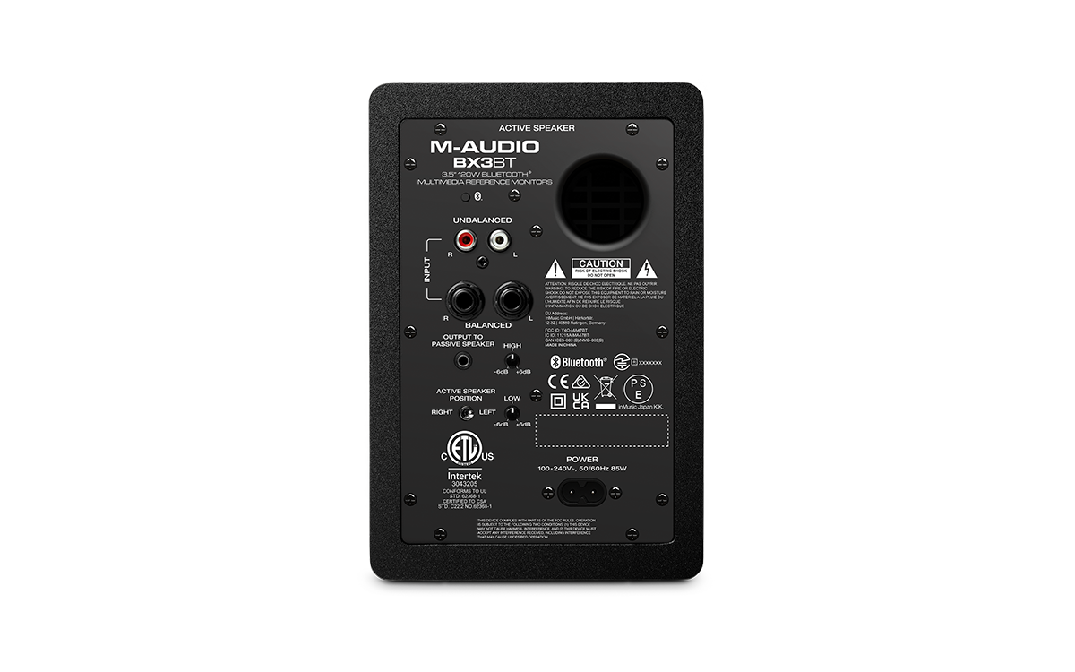 M-Audio BX3 BT features controls on the rear panel that let you customize the EQ and active speaker placement. High-EQ and Low-EQ controls enable anyone to add some extra rumble or clarity to their music. The Left/Right Active Speaker Position switch lets you choose which speaker is the Left or Right side. This is very useful if you are left-handed and want the speaker with the front panel volume control on your left side.