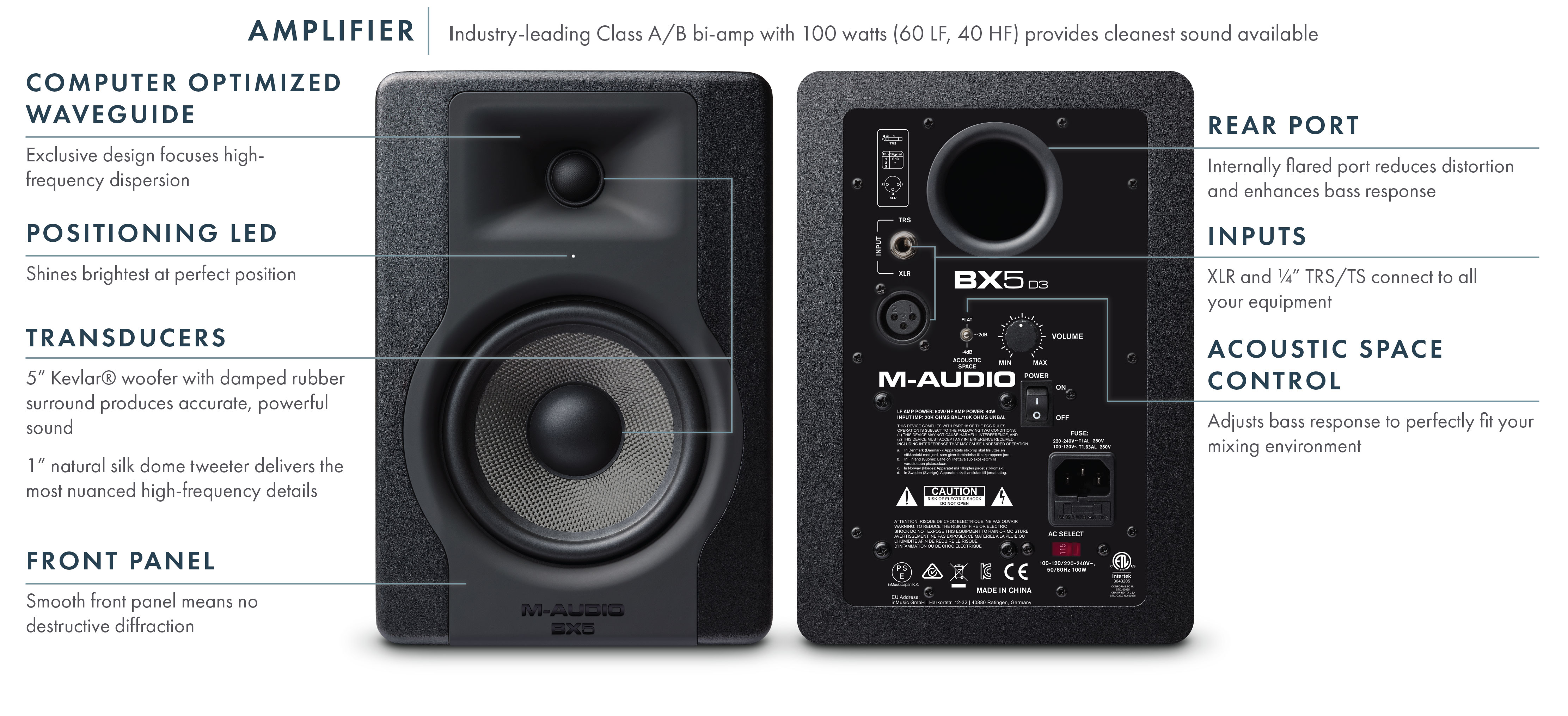 M-Audio’s BX5-D3 monitors excel in every way, the rightful successor to the original studio icon. Fusing superb drivers, meticulously engineered enclosures, great-sounding amplifiers, versatile control options and standardized connection facilities, BX5-D3 delivers sound quality you can trust.