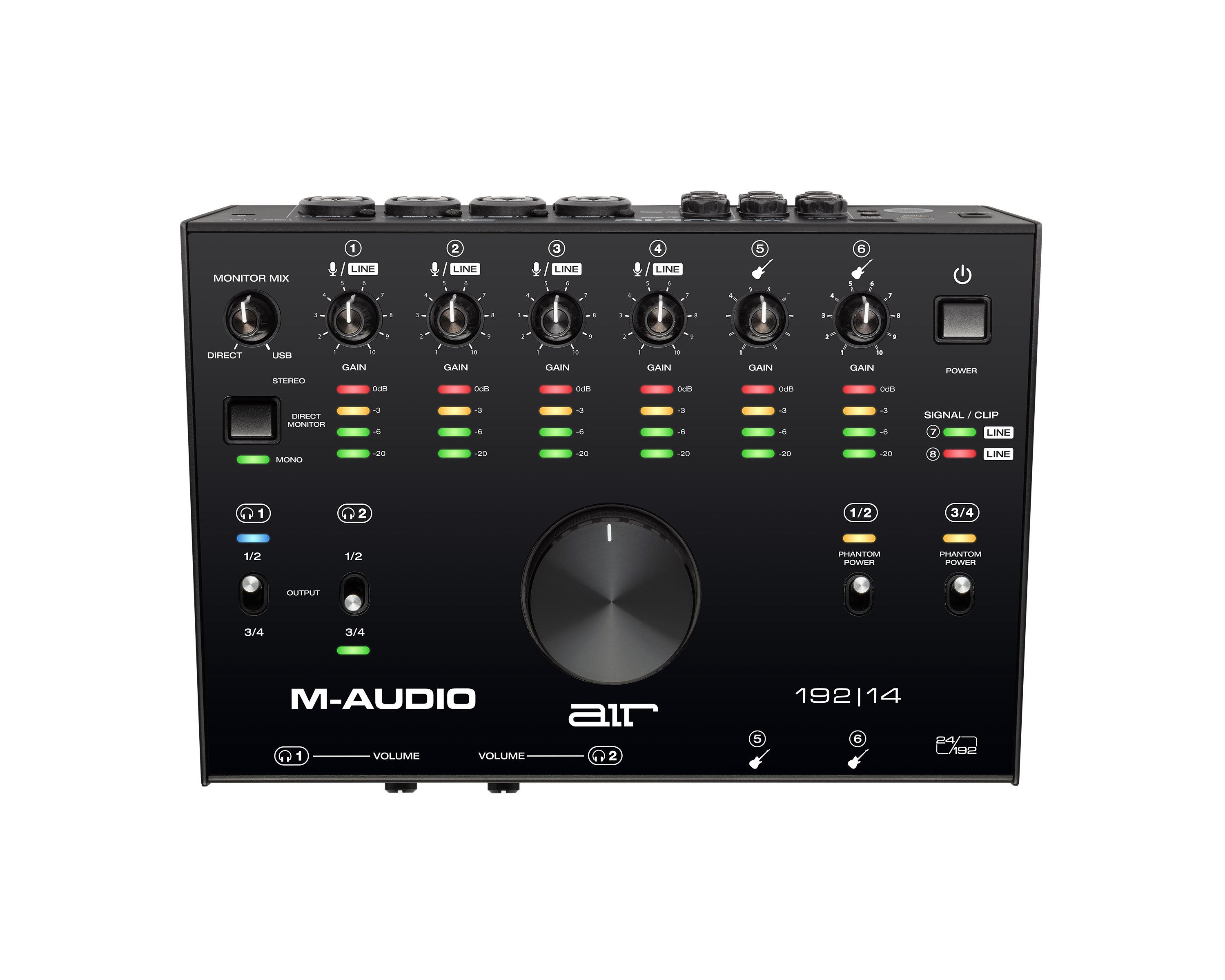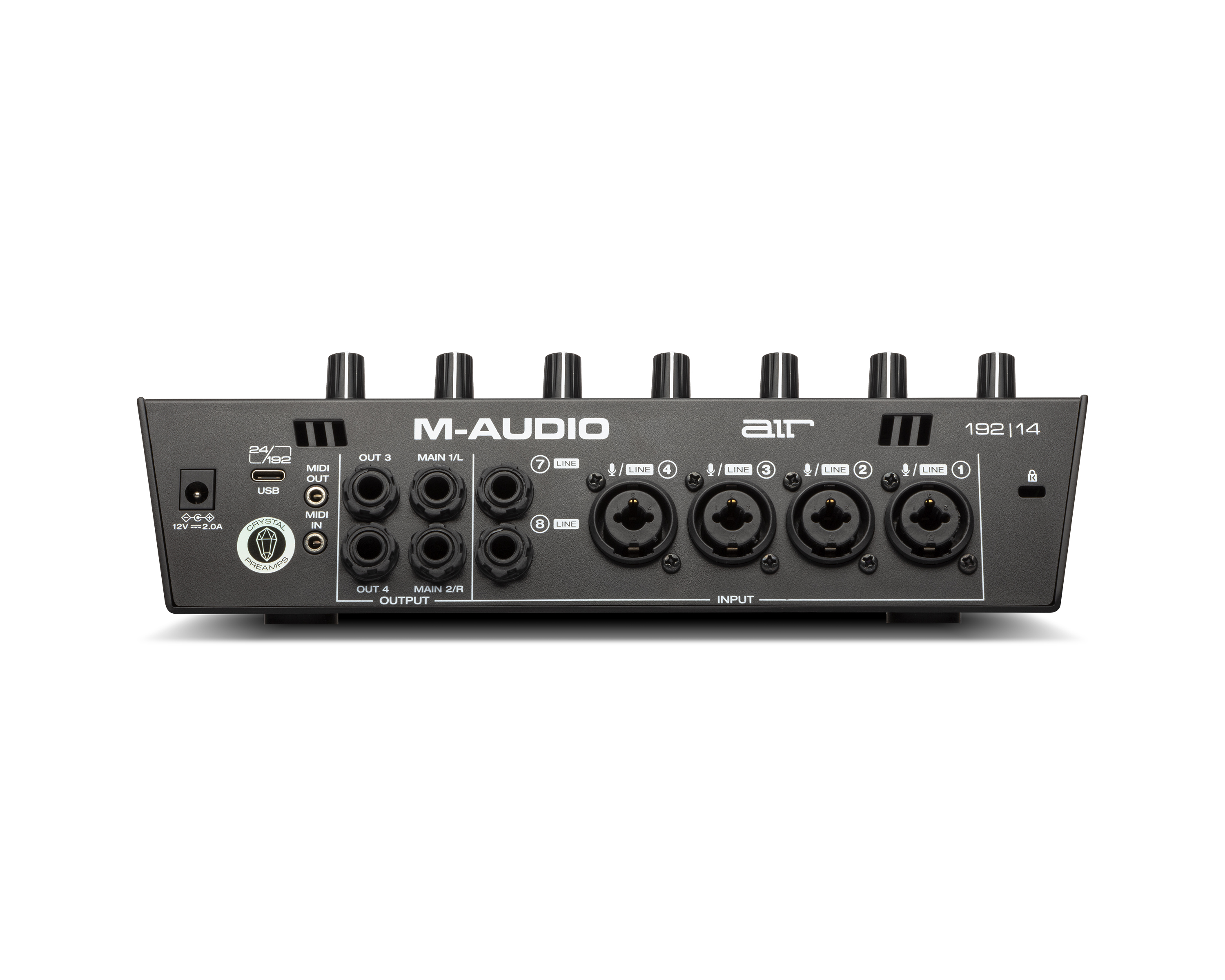 The M-Audio AIR 192|14 is an 8-in 4-out feature-packed USB audio/MIDI interface that provides all of the connections and software you need to easily create professional 24-bit/192kHz studio-quality recordings. The AIR 192|14 features (4) XLR+¼” TRS combo inputs, (2) ¼” line inputs and (2) ¼” instrument inputs that have a specially designed gain and impedance stage to provide the most accurate representation of your guitar or bass when plugged directly into the interface. There is also MIDI input and output connections so you can connect any external midi gear that you may have such as external sequencers, drum machines and controllers.